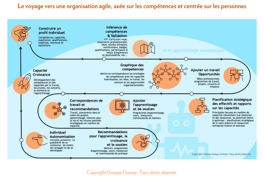 Le rapport Fosway Group propose un schéma qui résume les différentes étapes d’un circuit vertueux : celui d’une politique de valorisation et de développement des talents et des compétences dans une organisation qui place les collaborateurs et leur expérience de travail au premier plan. Le schéma part de l’individu et y revient, en passant par l’identification des compétences, leur cartographie, leur articulation et mise en relation avec les opportunités d’emploi, l’offre de formation, le planning stratégique des RH, le développement et l’empouvoirement de chacun… A chacune de ces étapes, l’intelligence artificielle apporte des données et des analyses. Elle ne remplace ni le flair du DRH ni son expertise : elle vient le seconder et démultiplier ses efforts, tout en crédibilisant sa parole et ses propositions.