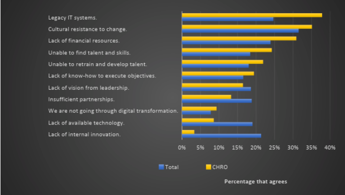 Oggi un CHRO su tre considera i sistemi IT legacy e le resistenze culturali al cambiamento i due principali ostacoli alla trasformazione digitale. Questi ostacoli alla trasformazione impediscono ai CHRO di trasformare la loro funzione in una funzione strategica, con sistemi e processi ancora concepiti per un sistema di record e non come sistema per la gestione dell’innovazione e la generazione di informazioni. Questo è un’ulteriore conseguenza della situazione in cui si trovano le aziende europee, che spesso si trovano a utilizzare un insieme complesso di sistemi informativi poco integrati per l’amministrazione del personale, la gestione delle paghe, il talent management, il performance management e altri processi relativi alle HR. Dare tutte le colpe all’IT legacy e alla non integrazione dei sistemi può essere fuorviante. La prima cosa che il CHRO deve tenere a mente è che la gestione del cambiamento deve iniziare dal suo dipartimento.