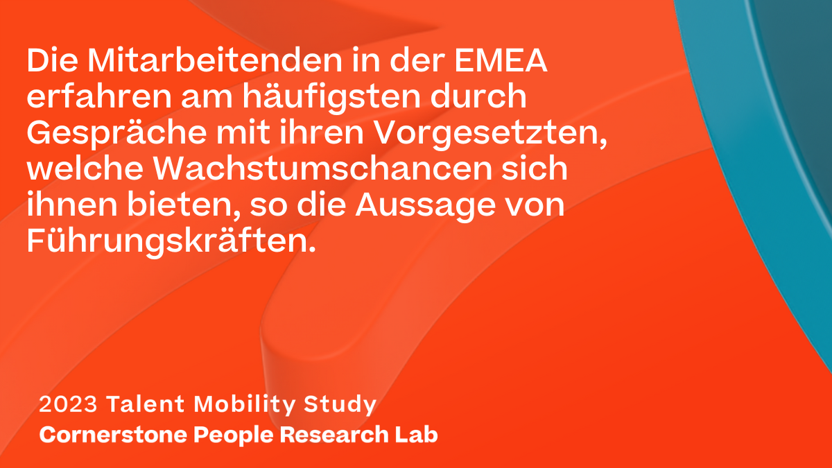 Viele Unternehmen in der EMEA-Region setzen bei der Karrieremobilität auf einen führungskräftebasierten Ansatz: Hierbei lastet die Verantwortung für die Karriereentwicklung zum Großteil auf den Schultern der Vorgesetzten, doch die Mitarbeitenden sehen die Verantwortung immer noch primär bei sich selbst. Führungskräfte in EMEA, die für Learning verantwortlich sind, meinen, dass Angestellte sich am besten durch Gespräche mit ihren Vorgesetzten einen Überblick über Weiterbildungsmöglichkeiten verschaffen können.