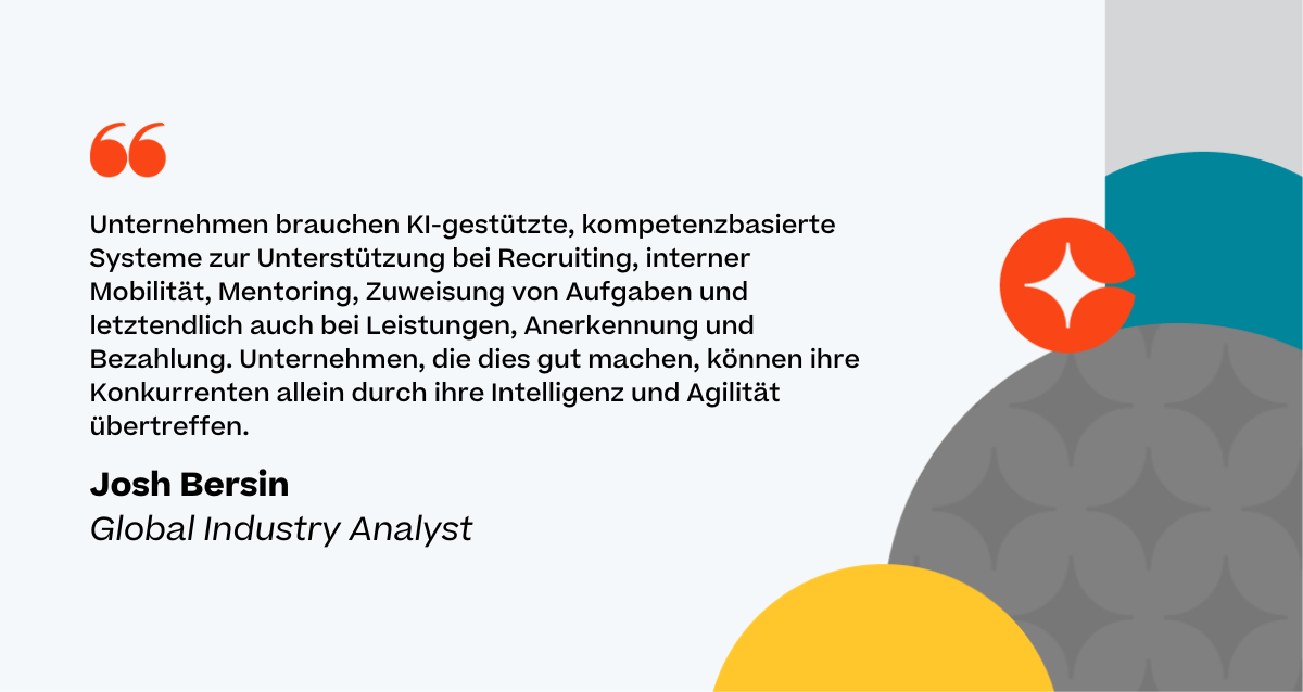 Der HR-Vordenker Josh Bersin von The Josh Bersin Company bestätigt dies: „Unternehmen brauchen KI-gestützte, kompetenzbasierte Systeme zur Unterstützung bei Recruiting, interner Mobilität, Mentoring, Zuweisung von Aufgaben und letztendlich auch bei Leistungen, Anerkennung und Bezahlung. Unternehmen, die dies gut machen, können ihre Konkurrenten allein durch ihre Intelligenz und Agilität übertreffen.“