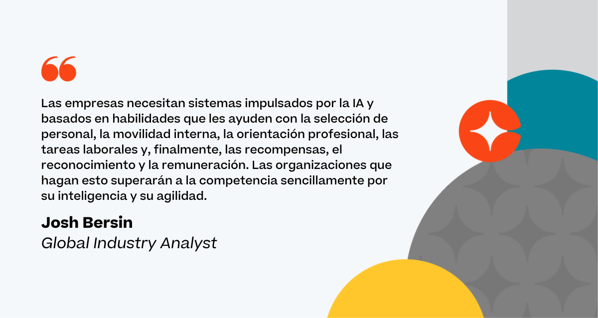El líder de pensamiento de RR. HH. Josh Bersin, de The Josh Bersin Company, coincide en esta opinión cuando dice: "Las empresas necesitan sistemas impulsados por la IA y basados en habilidades que les ayuden con la selección de personal, la movilidad interna, la orientación profesional, las tareas laborales y, finalmente, las recompensas, el reconocimiento y la remuneración. Las organizaciones que hagan esto superarán a la competencia sencillamente por su inteligencia y su agilidad".
