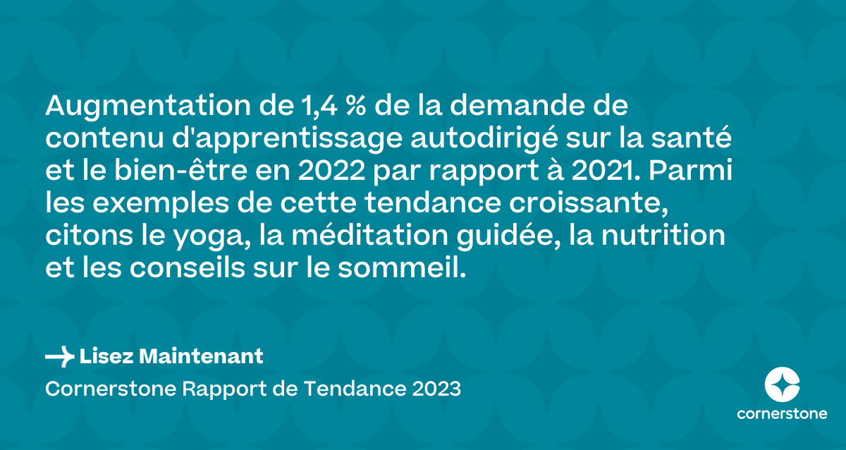 Selon Cornerstone Content Anytime, la demande de contenus de formation autonome sur le thème de la santé et du bien-être a été multipliée par 1,4 entre 2021 et 2022. C'est le cas par exemple des contenus sur le yoga au bureau, la méditation guidée, la nutrition et les conseils pour mieux dormir.