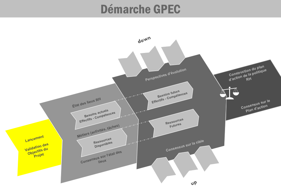 Si la connaissance et le partage des principales orientations stratégiques de l’organisations sont donc des éléments décisifs dans le cadre de la mise en place d'une Gestion Prévisionnelle de l'Emploi et des Compétences, la connaissance de celles-ci, au travers d'analyse et de réflexions préalables nécessite de rentrer dans une logique de type gestion de projet permettant de :