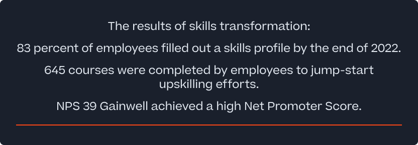 En mars 2022, Gainwell a lancé Skills Transformation sous le nom interne de « G>Force ». La première étape fondamentale fut de comprendre les compétences que possédaient les collaborateurs de Gainwell, pas seulement celles qui figuraient sur leur description de poste actuelle, mais tout ce qu’ils avaient appris au cours de leur carrière et qui pouvait être utile et pouvait être traduit dans le langage des compétences.