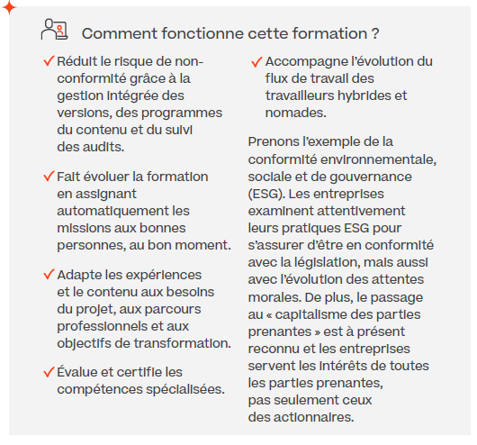 Nous percevons souvent la conformité comme une obligation. Mais, l’opérationnalisation de la conformité continue peut déboucher sur un avantage concurrentiel. En 2023, nous prévoyons une augmentation de l’apprentissage à fort impact et des Académies de développement des compétences, basées sur des méthodologies de formation à la conformité plus agiles et plus personnalisées. Ce type de formations, adaptées aux besoins spécifiques du secteur et alignées sur les objectifs futurs de l'entreprise, peut réduire les délais et les coûts nécessaires au reporting et à la mise en œuvre d'une formation à la conformité fiable, tout en améliorant la rétention des compétences.
