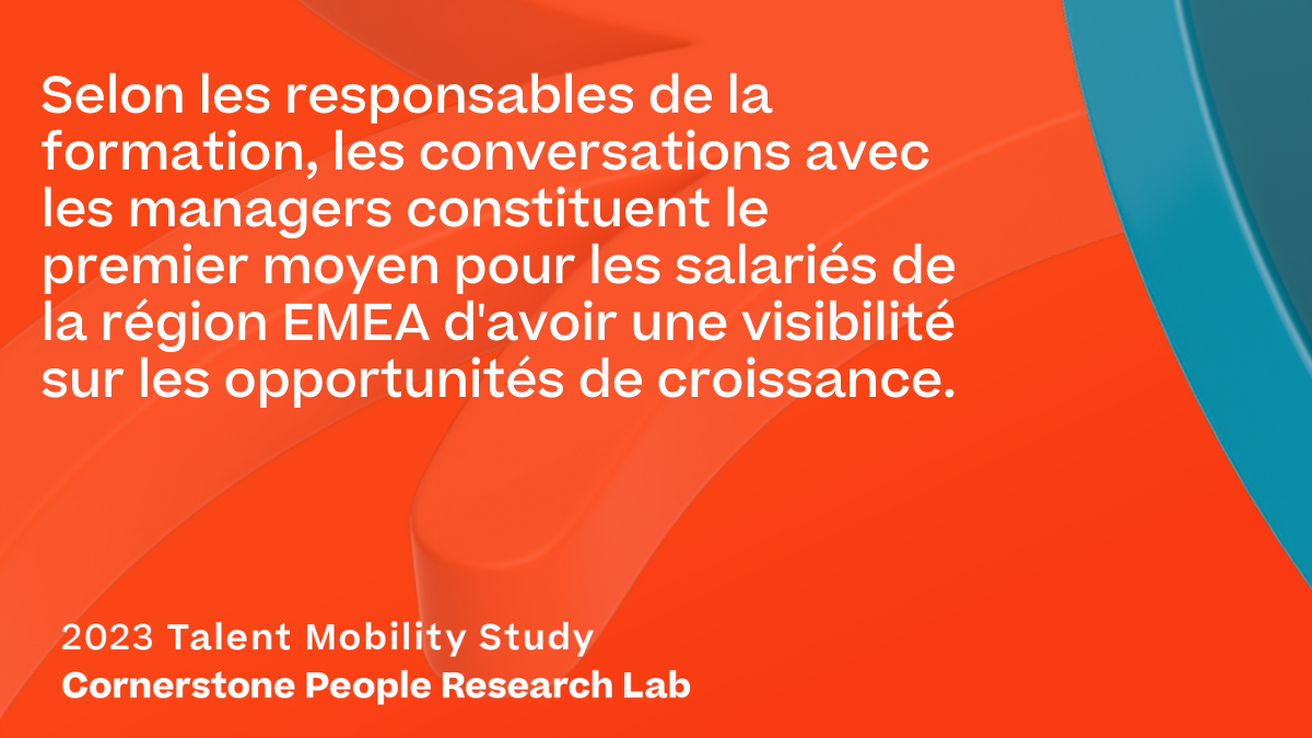Dans la région EMEA, les organisations ont adopté une approche de la mobilité professionnelle centrée sur les managers, où la responsabilité en matière de carrière repose largement sur les épaules du supérieur direct des employés, même si ces derniers se considèrent, eux, principaux responsables de leur destin. Selon les leaders dans le domaine de la formation en EMEA, le premier moyen de gagner en visibilité sur les opportunités d'évolution reste l'entretien avec son manager.