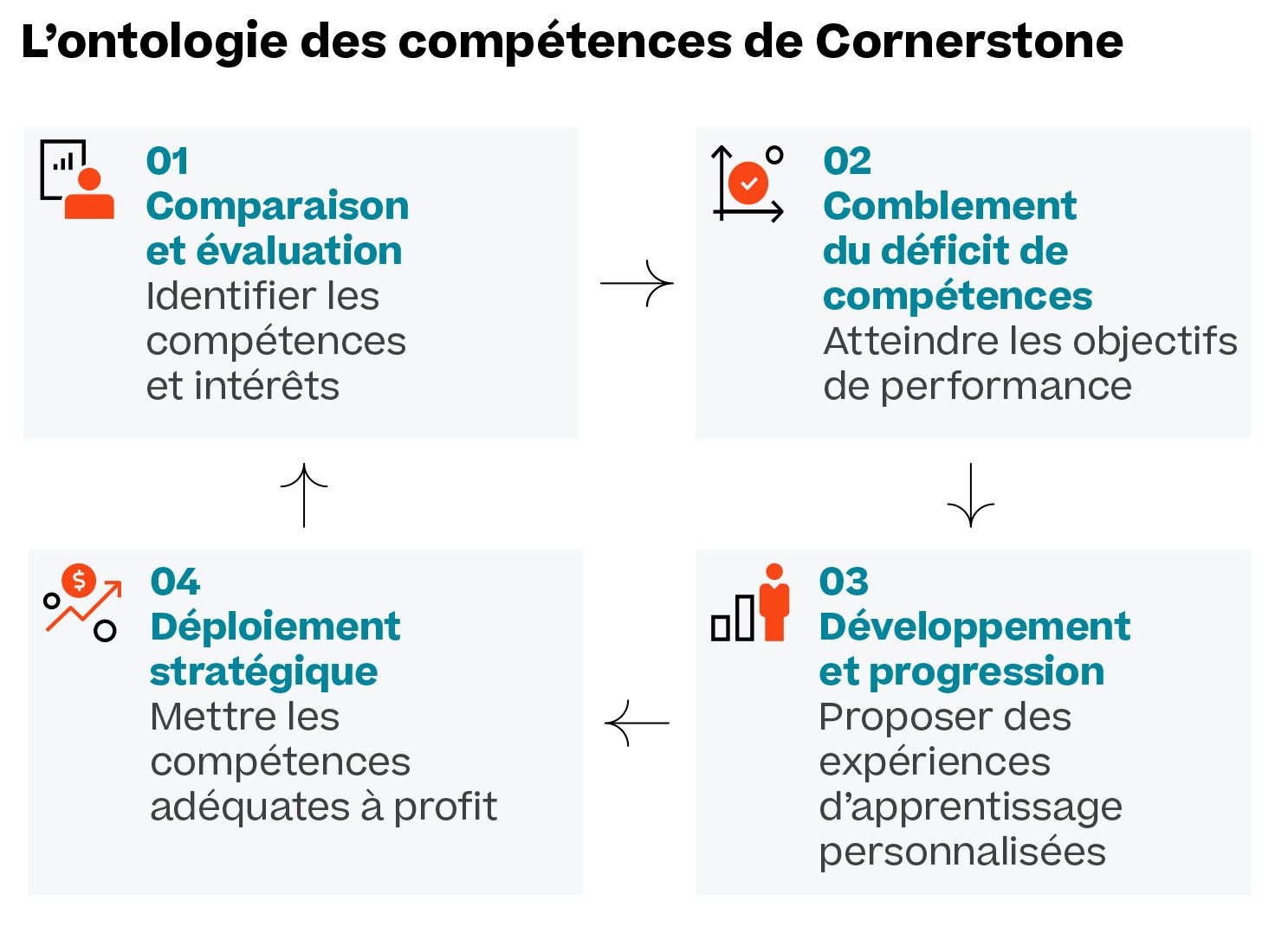Mais une ontologie des compétences seule n’est d’aucune utilité. C’est en l’intégrant à des solutions de gestion des talents comme un ou un système de qu’elle prend tout son sens. Le fait de prioriser les compétences permet aux managers, aux dirigeants et aux individus de s’intéresser à leurs propres compétences, au lieu de compter sur les responsables de la formation et du développement pour guider leur progression de carrière.