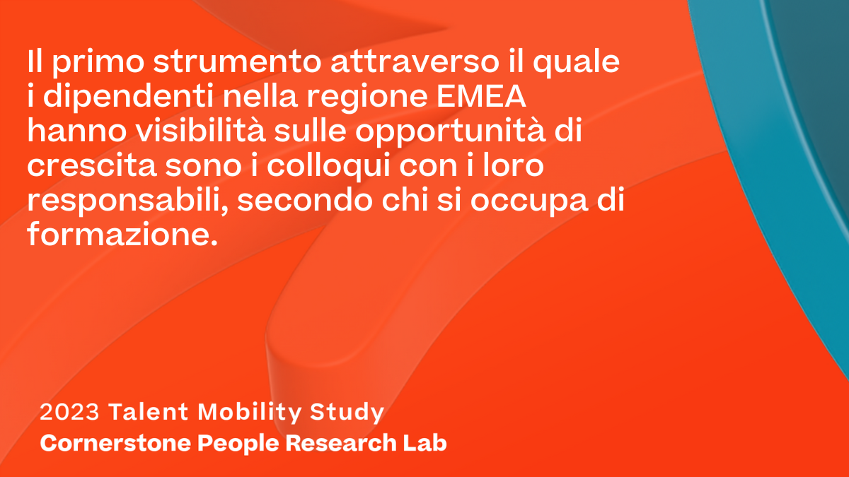 Le organizzazioni nella regione EMEA hanno adottato un approccio alla mobilità di carriera incentrato sui manager, mettendo la responsabilità della crescita professionale principalmente nelle mani del diretto supervisore di ciascun addetto, mentre i dipendenti pongono la responsabilità primaria su se stessi. I responsabili della formazione nell’area EMEA affermano che il primo strumento attraverso cui la loro forza lavoro ha visibilità sulle opportunità di crescita professionale sono i colloqui con i responsabili.