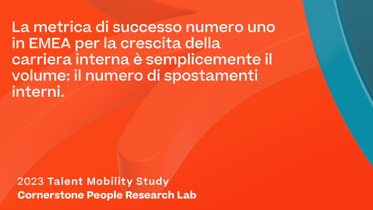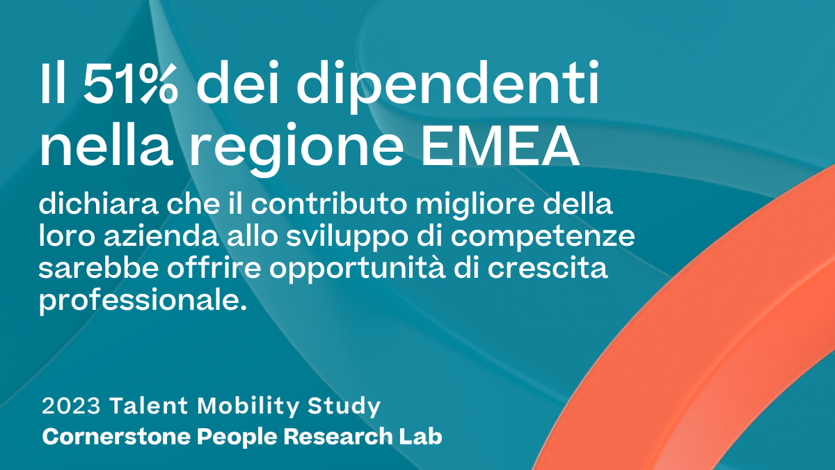 Quando un'organizzazione deve colmare lacune di competenze con la massima urgenza ma non trova persone con le competenze richieste, il posto migliore dove cercare è letteralmente sotto il loro naso. I dipendenti vogliono crescere e le aziende vogliono crescere con loro. Nella regione EMEA i manager svolgono un ruolo chiave, perché l'approccio alla carriera e alla crescita professionale dei dipendenti è fortemente incentrato sui manager. Investendo nella mobilità dei talenti, le aziende possono coltivare una cultura della carriera lavorativa, esaltare l'esperienza del dipendente e definire percorsi di carriera a breve e lungo termine per il personale. Aziende e dipendenti concentrati sulla mobilità dei talenti possono crescere di più e più velocemente. Ma solo se lavorano insieme.