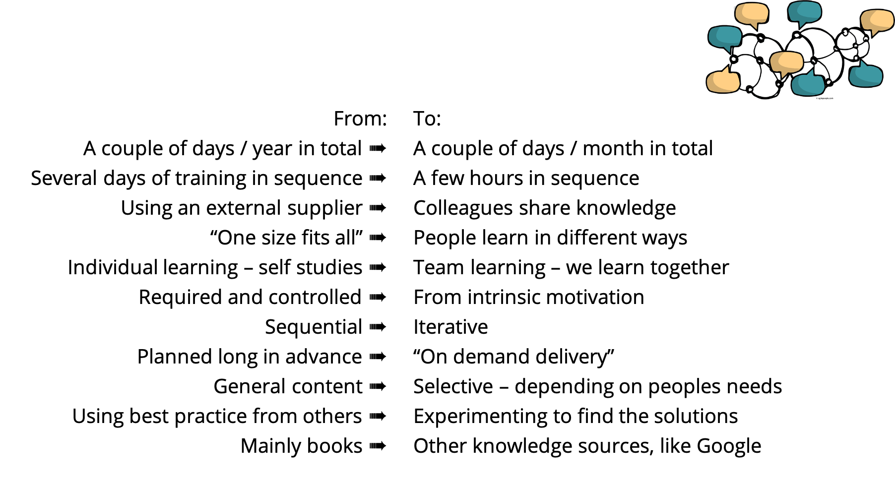 The learning process is becoming faster, it is divided into smaller pieces, occurs more often and linked to demand, and it is adapted to the individual, and to the current climate. Access to knowledge needs to be easy and available when we need it, on-demand. We are moving away from the process of educating ourselves for a long time, forgetting half of it, to a world where the knowledge is in front of us just when it is needed. We use more internal expertise and less external "experts". We can learn a lot from our colleagues, especially if we work towards a T-shaped competence.