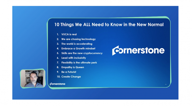 The “new normal” isn’t quite “new” anymore, Cornerstone’s Jeff Miller, CLO and VP of Organisational Effectiveness, and Kimberly Cassady, CTO, pointed out in 10 things leaders need to know in the new normal. “We need to be proactively making change before we have to reactively make or respond to it,” Jeff said. What does that look like in practice? Jeff and Kim offered these 10 recommendations: