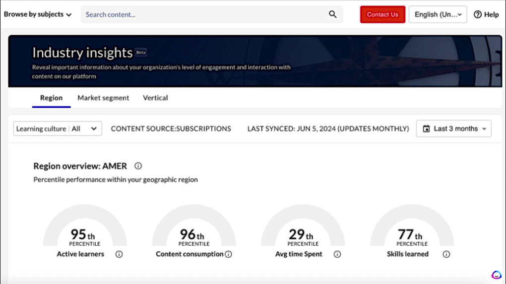 Visualize, understand, and benchmark performance against other organizations in the same region, market segment, and vertical. Gain valuable industry insights into content consumption, active learners, average learning time and skills acquired.